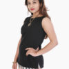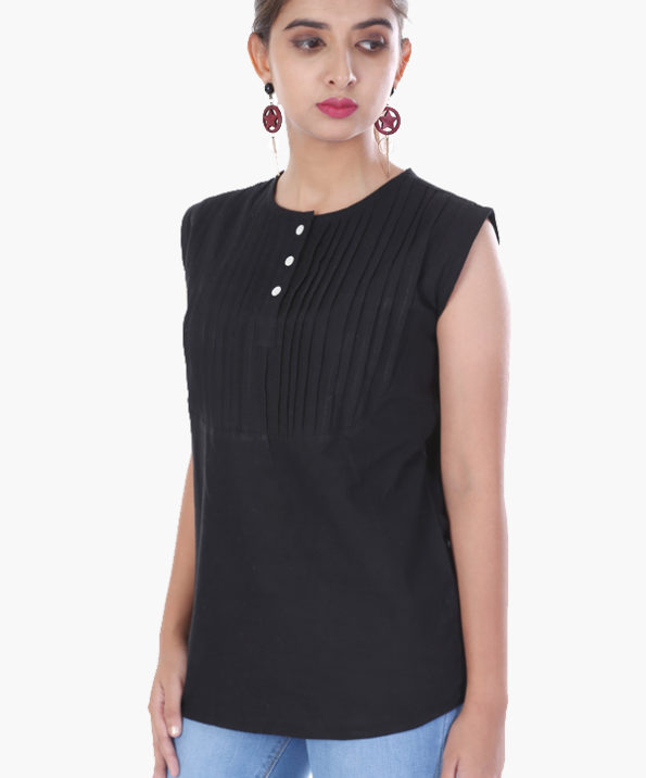 This short sleeveless top is made of pure khadi fabric accentuated with tucks on the yoke with mandarin collar and short button placket closed with natural river shell buttons. This is a simple short sleeveless top yet the embellishment amplifies the style appeal. may pair with regular jeans. Your purchase can help to provide fair wages to artisans in Maharashtra.